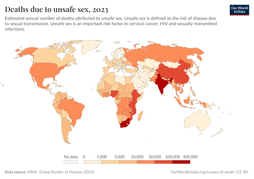“Data Page: Deaths due to unsafe sex”, part of the following publication: Esteban Ortiz-Ospina and Max Roser (2016) - “Global Health”. Data adapted from IHME, Global Burden of Disease. Retrieved from https://chrome-plugin.owid.pages.dev/grapher/deaths-due-to-unsafe-sex [online resource]How to cite this data