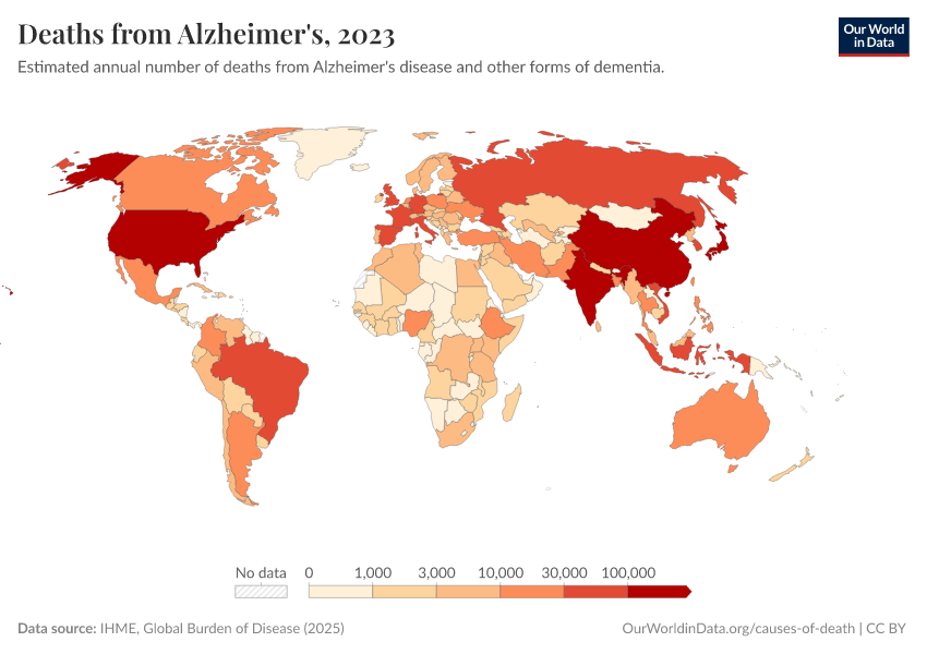 “Data Page: Deaths from Alzheimer's”, part of the following publication: Esteban Ortiz-Ospina and Max Roser (2016) - “Global Health”. Data adapted from IHME, Global Burden of Disease. Retrieved from https://chrome-plugin.owid.pages.dev/grapher/deaths-from-alzheimers [online resource]How to cite this data