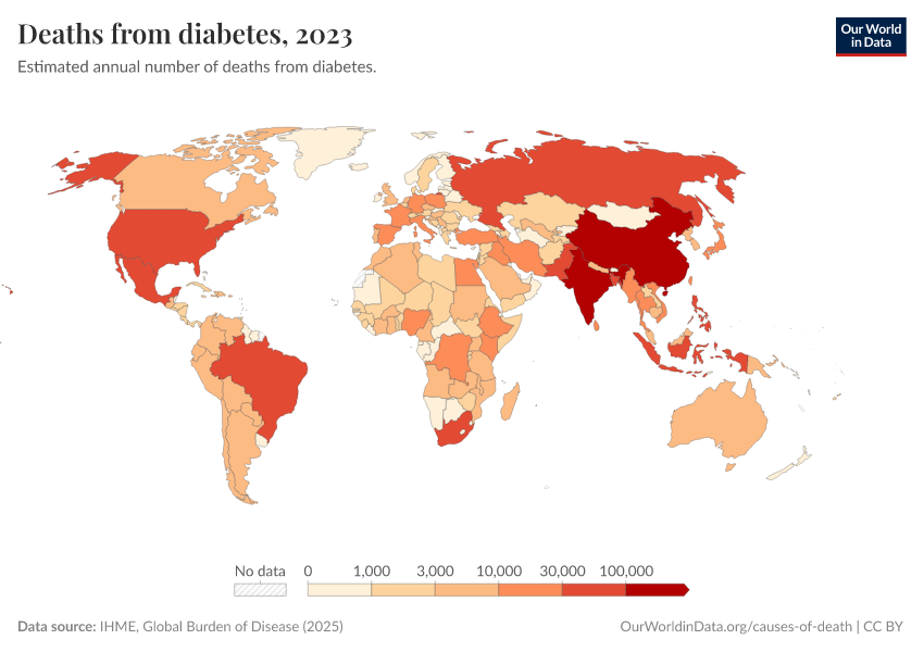 “Data Page: Deaths from diabetes”, part of the following publication: Esteban Ortiz-Ospina and Max Roser (2016) - “Global Health”. Data adapted from IHME, Global Burden of Disease. Retrieved from https://chrome-plugin.owid.pages.dev/grapher/deaths-from-diabetes [online resource]How to cite this data