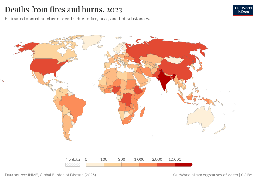 “Data Page: Deaths from fires and burns”, part of the following publication: Esteban Ortiz-Ospina and Max Roser (2016) - “Global Health”. Data adapted from IHME, Global Burden of Disease. Retrieved from https://chrome-plugin.owid.pages.dev/grapher/deaths-from-fires-and-burns [online resource]How to cite this data