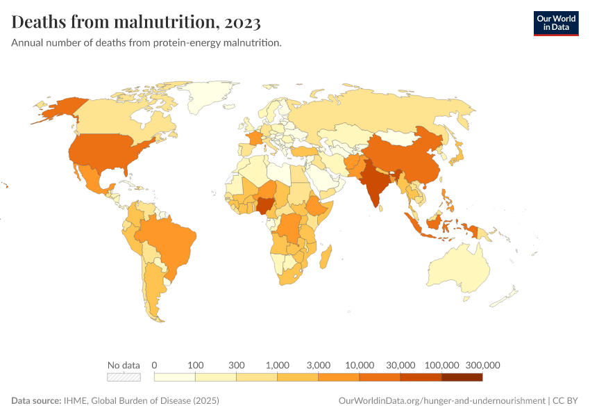IHME, Global Burden of Disease (2024) – with minor processing by Our World in Data. “Deaths from malnutrition” [dataset]. IHME, Global Burden of Disease, “Global Burden of Disease - Deaths and DALYs” [original data]. Retrieved January 9, 2026 from https://chrome-plugin.owid.pages.dev/grapher/deaths-from-malnutrition