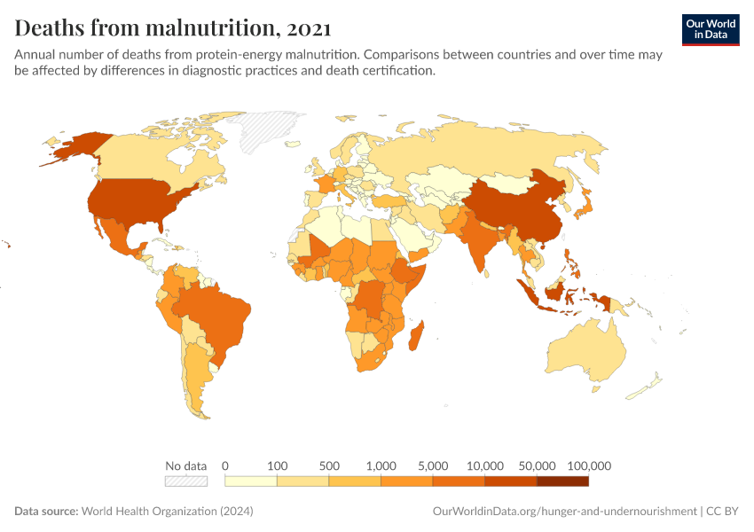 World Health Organization (2024) – with major processing by Our World in Data. “Deaths from malnutrition” [dataset]. World Health Organization, “Global Health Estimates” [original data]. Retrieved January 9, 2026 from https://chrome-plugin.owid.pages.dev/grapher/deaths-from-malnutrition-ghe