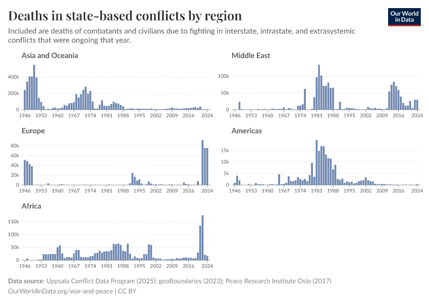 Uppsala Conflict Data Program (2025); geoBoundaries (2023); Peace Research Institute Oslo (2017) – processed by Our World in Data. “Deaths in state-based conflicts by region” [dataset]. Uppsala Conflict Data Program, “Georeferenced Event Dataset v25.1”; geoBoundaries, “geoBoundaries - Comprehensive Global Administrative Zones (CGAZ) 6.0.0”; Peace Research Institute Oslo, “Battle deaths v3.1” [original data]. Retrieved January 9, 2026 from https://chrome-plugin.owid.pages.dev/grapher/deaths-in-state-based-conflicts-by-region