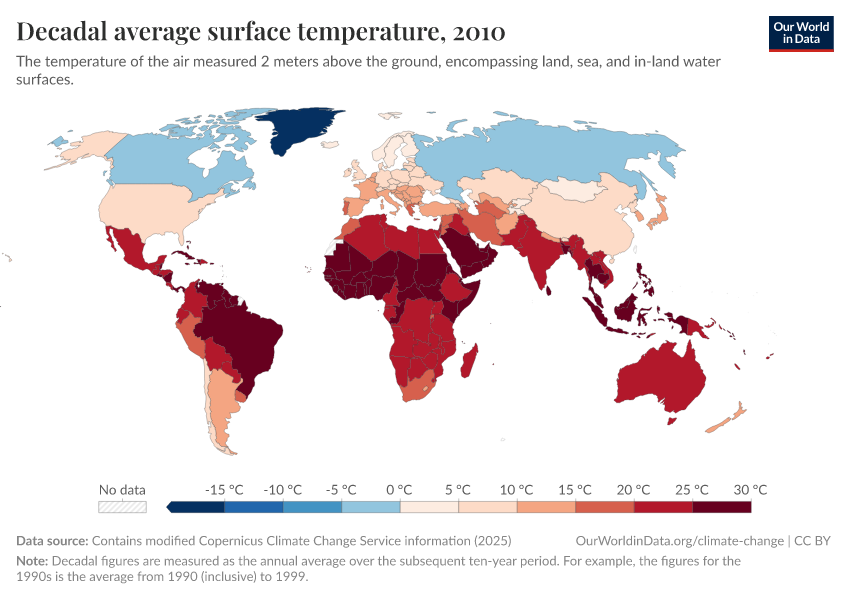 “Data Page: Decadal average surface temperature”, part of the following publication: Hannah Ritchie, Pablo Rosado, and Veronika Samborska (2024) - “Climate Change”. Data adapted from Contains modified Copernicus Climate Change Service information. Retrieved from https://chrome-plugin.owid.pages.dev/grapher/decadal-average-surface-temperature [online resource]How to cite this data