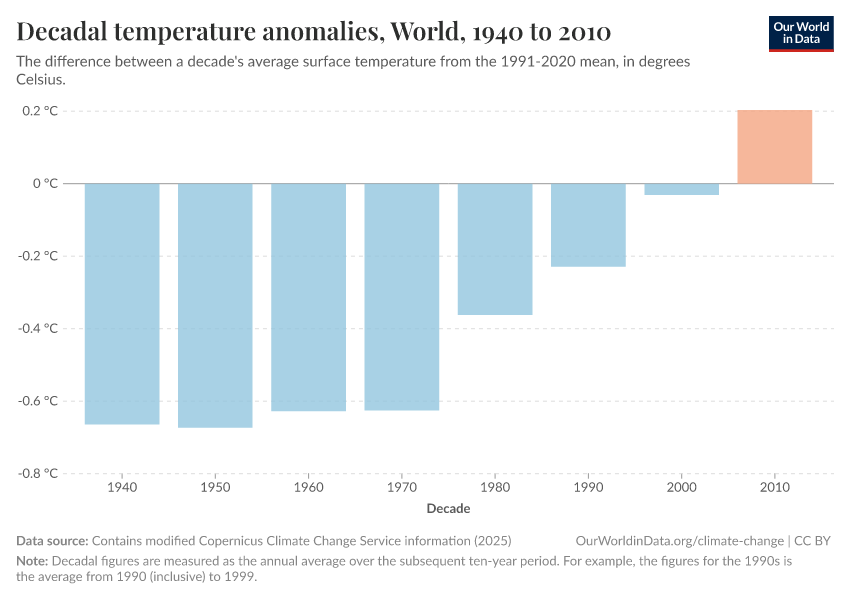 Contains modified Copernicus Climate Change Service information (2025) – with major processing by Our World in Data. “Decadal temperature anomalies” [dataset]. Contains modified Copernicus Climate Change Service information, “ERA5 monthly averaged data on single levels from 1940 to present 2” [original data]. Retrieved January 9, 2026 from https://chrome-plugin.owid.pages.dev/grapher/decadal-temperature-anomaly