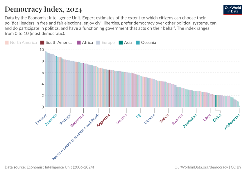 Economist Intelligence Unit (2006-2024) – processed by Our World in Data. “Democracy index – Economist Intelligence Unit” [dataset]. Economist Intelligence Unit, “Democracy Index 2021: The China challenge”; Economist Intelligence Unit, “Democracy Index 2022: Frontline democracy and the battle for Ukraine”; Economist Intelligence Unit, “Democracy Index 2023: Age of Conflict”; Economist Intelligence Unit, “Democracy Index 2024: What's wrong with representative democracy?”; Gapminder, “Democracy Index v4”; Various sources, “Population” [original data]. Retrieved January 9, 2026 from https://chrome-plugin.owid.pages.dev/grapher/democracy-index-eiu