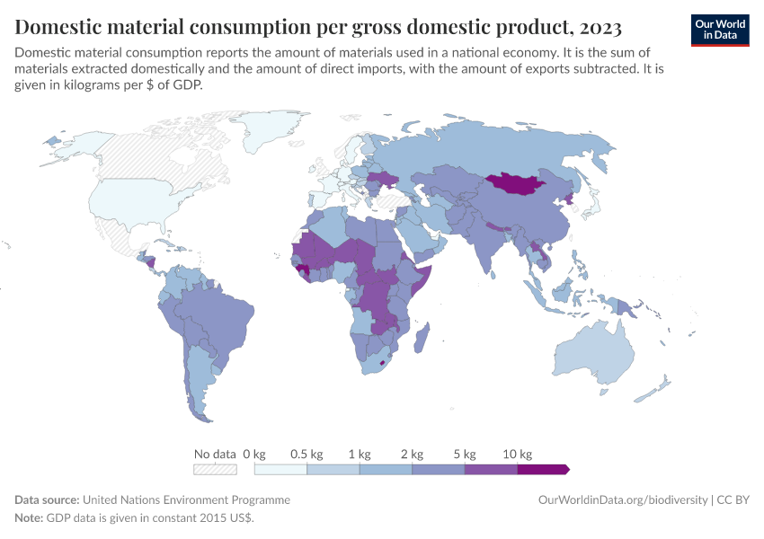 United Nations Environment Programme – processed by Our World in Data. “Domestic material consumption per gross domestic product” [dataset]. United Nations Environment Programme, “WESR / Global Material Flows Database” [original data]. Retrieved January 9, 2026 from https://chrome-plugin.owid.pages.dev/grapher/domestic-material-consumption-per-unit-of-gdp