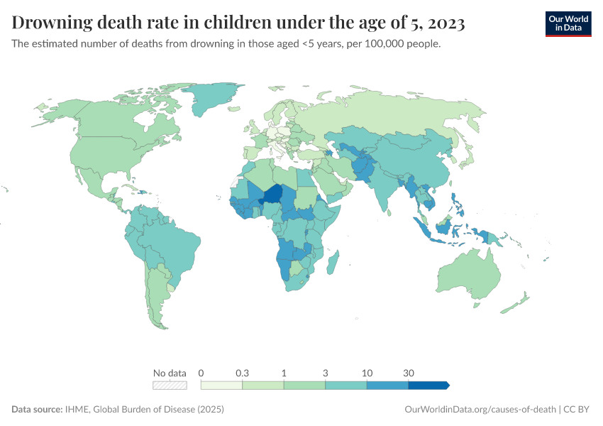 IHME, Global Burden of Disease (2024) – with minor processing by Our World in Data. “Drowning death rate in children under the age of 5” [dataset]. IHME, Global Burden of Disease, “Global Burden of Disease - Deaths and DALYs” [original data]. Retrieved January 9, 2026 from https://chrome-plugin.owid.pages.dev/grapher/drowning-death-rates-under-5
