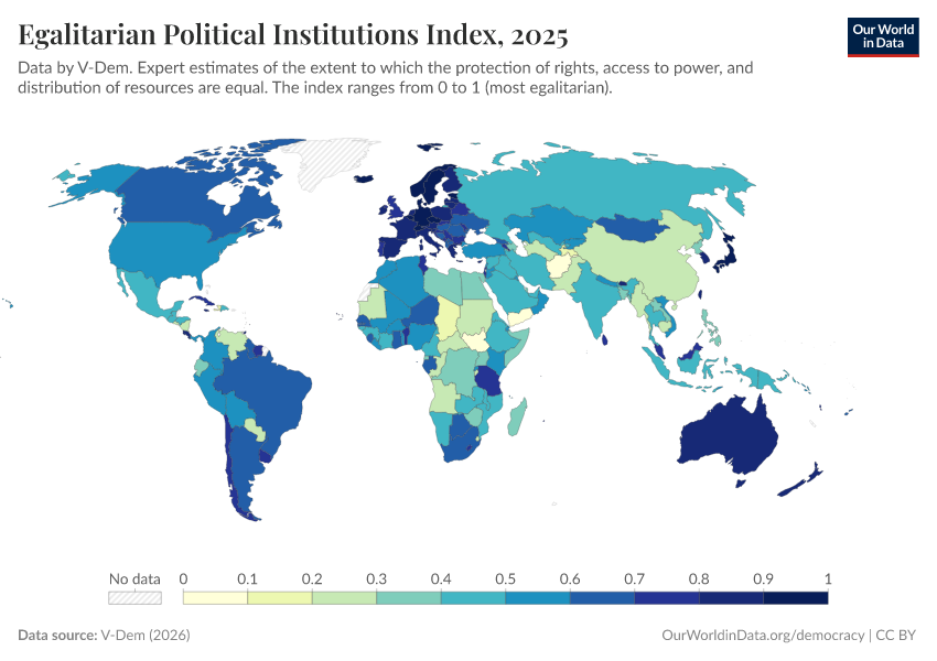 V-Dem (2025) – processed by Our World in Data. “Egalitarian political institutions index – V-Dem” [dataset]. V-Dem, “Democracy report v15” [original data]. Retrieved January 9, 2026 from https://chrome-plugin.owid.pages.dev/grapher/egalitarian-political-institutions-index