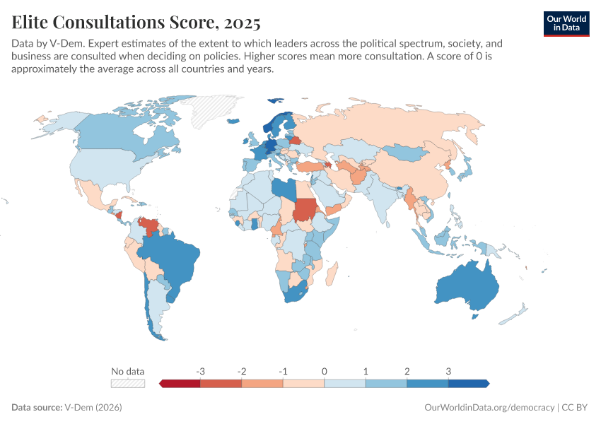 V-Dem (2025) – processed by Our World in Data. “Elite consultation – V-Dem” [dataset]. V-Dem, “Democracy report v15” [original data]. Retrieved January 9, 2026 from https://chrome-plugin.owid.pages.dev/grapher/elite-consultations-score