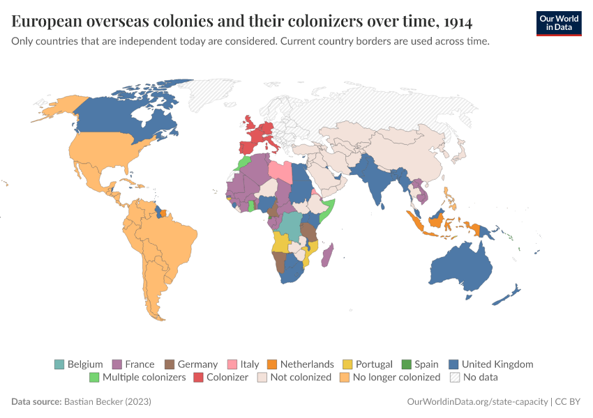 “Data Page: European overseas colonies and their colonizers over time”, part of the following publication: Bastian Herre and Pablo Arriagada (2023) - “State Capacity”. Data adapted from Bastian Becker. Retrieved from https://chrome-plugin.owid.pages.dev/grapher/european-overseas-colonies-and-their-colonizers [online resource]How to cite this data