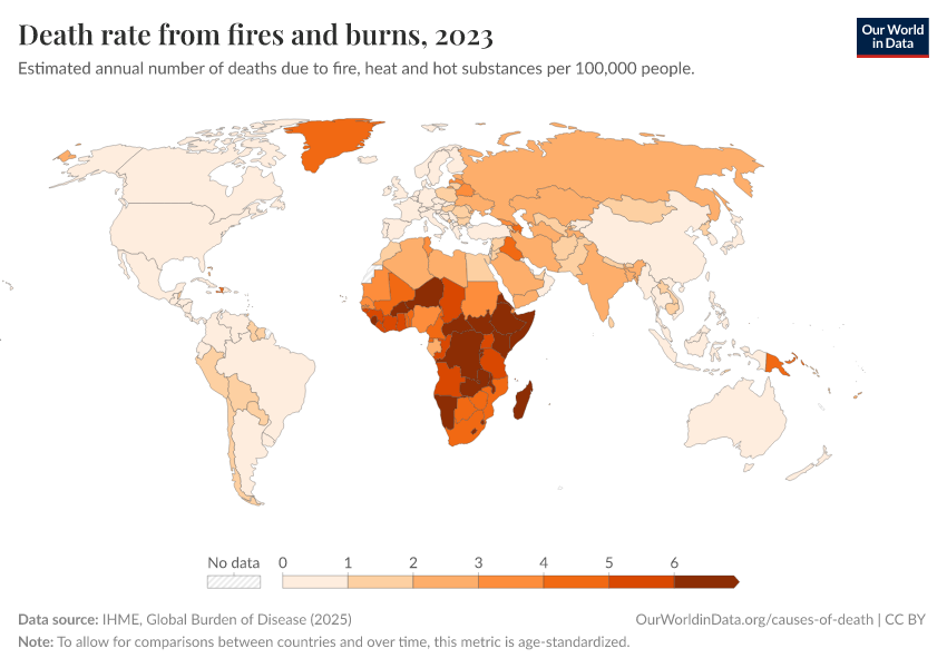 IHME, Global Burden of Disease (2024) – with minor processing by Our World in Data. “Death rate from fires and burns” [dataset]. IHME, Global Burden of Disease, “Global Burden of Disease - Deaths and DALYs” [original data]. Retrieved January 9, 2026 from https://chrome-plugin.owid.pages.dev/grapher/fire-death-rates