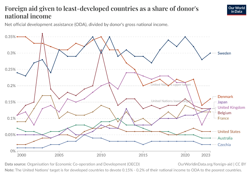 “Data Page: Foreign aid given to least-developed countries as a share of donor's national income”. Our World in Data (2026). Data adapted from Organisation for Economic Co-operation and Development. Retrieved from https://chrome-plugin.owid.pages.dev/grapher/foreign-aid-given-to-least-developed-countries-as-a-share-of-donors-national-income [online resource]How to cite this data