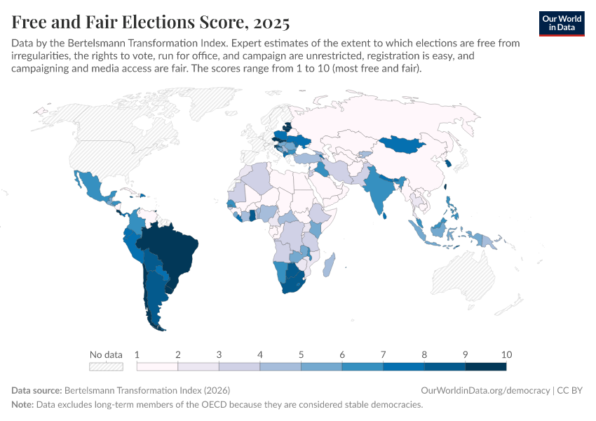 Bertelsmann Transformation Index (2024) – processed by Our World in Data. “Free and fair elections score” [dataset]. Bertelsmann Transformation Index, “Bertelsmann Transformation Index, Scores” [original data]. Retrieved January 9, 2026 from https://chrome-plugin.owid.pages.dev/grapher/free-fair-elections-bti