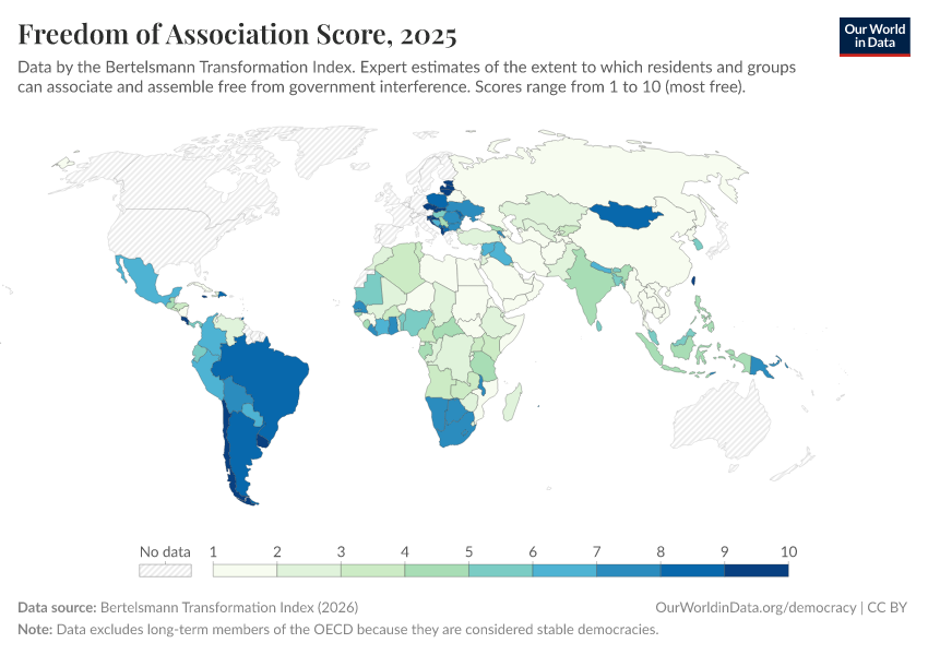“Data Page: Freedom of association score”, part of the following publication: Bastian Herre, Lucas Rodés-Guirao, and Esteban Ortiz-Ospina (2013) - “Democracy”. Data adapted from Bertelsmann Transformation Index. Retrieved from https://chrome-plugin.owid.pages.dev/grapher/freedom-of-association-score-bti [online resource]How to cite this data