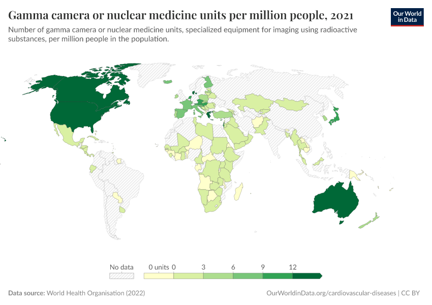 “Data Page: Gamma camera or nuclear medicine units per million people”, part of the following publication: Saloni Dattani, Veronika Samborska, Hannah Ritchie, and Max Roser (2023) - “Cardiovascular Diseases”. Data adapted from World Health Organisation. Retrieved from https://chrome-plugin.owid.pages.dev/grapher/gamma-camera-or-nuclear-medicine-availability [online resource]How to cite this data