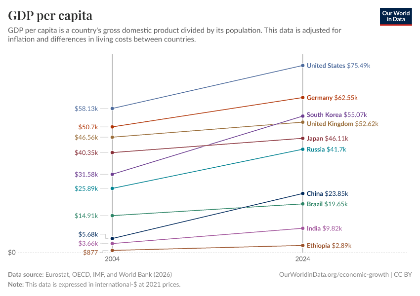 “Data Page: GDP per capita”, part of the following publication: Max Roser, Bertha Rohenkohl, Pablo Arriagada, Joe Hasell, Hannah Ritchie, and Esteban Ortiz-Ospina (2023) - “Economic Growth”. Data adapted from Eurostat, OECD, IMF, and World Bank. Retrieved from https://chrome-plugin.owid.pages.dev/grapher/gdp-per-capita-worldbank [online resource]