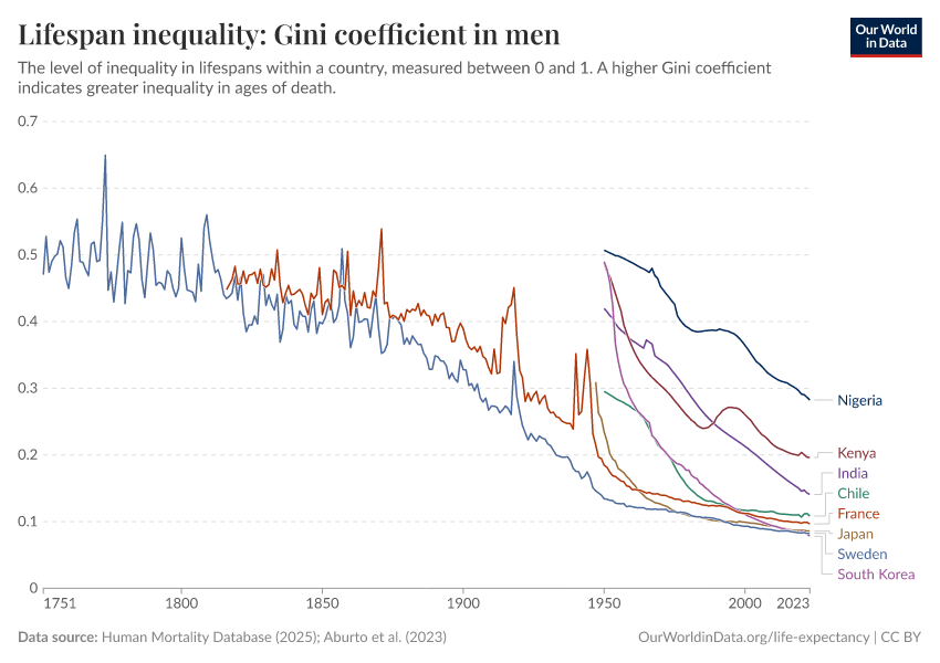 “Data Page: Lifespan inequality: Gini coefficient in men”, part of the following publication: Saloni Dattani, Lucas Rodés-Guirao, Hannah Ritchie, Esteban Ortiz-Ospina, and Max Roser (2023) - “Life Expectancy”. Data adapted from Human Mortality Database, United Nations. Retrieved from https://chrome-plugin.owid.pages.dev/grapher/gini-coefficient-of-lifespan-inequality-in-males [online resource]How to cite this data