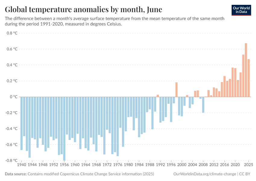 Contains modified Copernicus Climate Change Service information (2025) – with major processing by Our World in Data. “Global temperature anomalies by month” [dataset]. Contains modified Copernicus Climate Change Service information, “ERA5 monthly averaged data on single levels from 1940 to present 2” [original data]. Retrieved January 9, 2026 from https://chrome-plugin.owid.pages.dev/grapher/global-temperature-anomalies-by-month