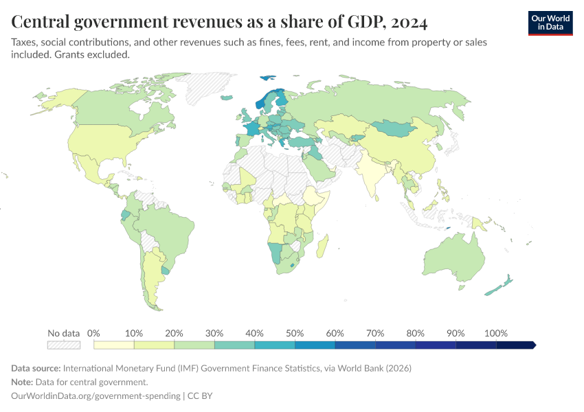 “Data Page: Central government revenues as a share of GDP”. Our World in Data (2026). Data adapted from International Monetary Fund (IMF) Government Finance Statistics, via World Bank. Retrieved from https://chrome-plugin.owid.pages.dev/grapher/government-revenues-as-a-share-of-gdp-world-bank [online resource]How to cite this data