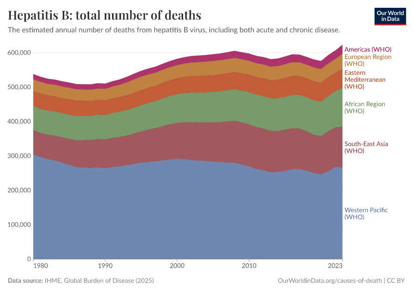 IHME, Global Burden of Disease (2024) – with minor processing by Our World in Data. “Hepatitis B: total number of deaths” [dataset]. IHME, Global Burden of Disease, “Global Burden of Disease - Deaths and DALYs” [original data]. Retrieved January 9, 2026 from https://chrome-plugin.owid.pages.dev/grapher/hepatitis-b-number-of-deaths