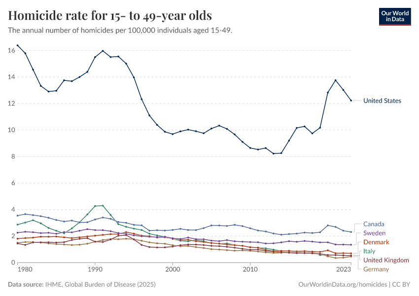 IHME, Global Burden of Disease (2024) – with minor processing by Our World in Data. “Homicide rate for 15- to 49-year olds” [dataset]. IHME, Global Burden of Disease, “Global Burden of Disease - Deaths and DALYs” [original data]. Retrieved January 9, 2026 from https://chrome-plugin.owid.pages.dev/grapher/homicide-rate-in-15--to-49-year-olds