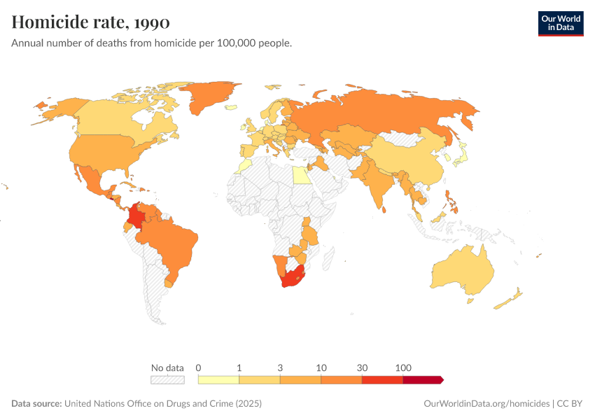 UN, World Population Prospects (2024); United Nations Office on Drugs and Crime (2025) – with major processing by Our World in Data. “Homicide rate per 100,000 population” [dataset]. United Nations Office on Drugs and Crime, “United Nations Office on Drugs and Crime - Intentional Homicide Victims”; United Nations, “World Population Prospects”; Various sources, “Population” [original data]. Retrieved January 9, 2026 from https://chrome-plugin.owid.pages.dev/grapher/homicide-rate-unodc