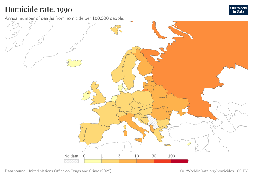 “Data Page: Homicide rate per 100,000 population”, part of the following publication: Bastian Herre, Fiona Spooner, and Max Roser (2013) - “Homicides”. Data adapted from United Nations Office on Drugs and Crime, United Nations, Various sources. Retrieved from https://chrome-plugin.owid.pages.dev/grapher/homicide-rate-unodc [online resource]