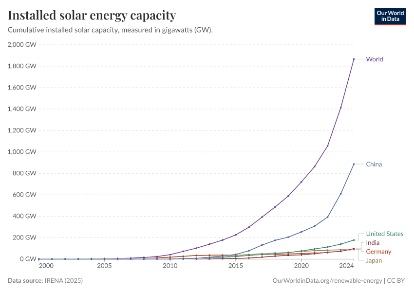 IRENA (2025) – processed by Our World in Data. “Total solar capacity” [dataset]. IRENA, “Renewable Energy Statistics” [original data]. Retrieved January 9, 2026 from https://chrome-plugin.owid.pages.dev/grapher/installed-solar-pv-capacity