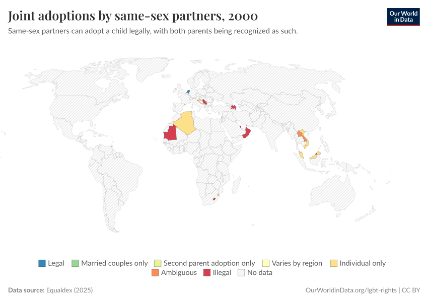 “Data Page: Joint adoptions by same-sex partners”, part of the following publication: Bastian Herre and Pablo Arriagada (2023) - “LGBT+ Rights”. Data adapted from Equaldex. Retrieved from https://chrome-plugin.owid.pages.dev/grapher/joint-adoptions-same-sex-partners-equaldex [online resource]How to cite this data