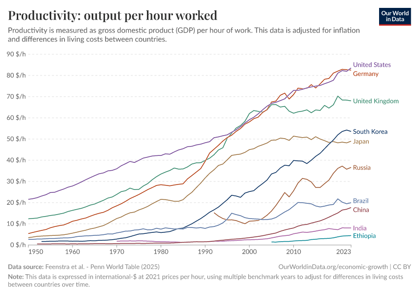 Feenstra et al. - Penn World Table (2025) – with major processing by Our World in Data. “Productivity: output per hour worked – Penn World Table – In constant international-$” [dataset]. Feenstra et al., “Penn World Table 11.0” [original data]. Retrieved January 9, 2026 from https://chrome-plugin.owid.pages.dev/grapher/labor-productivity-per-hour-pennworldtable
