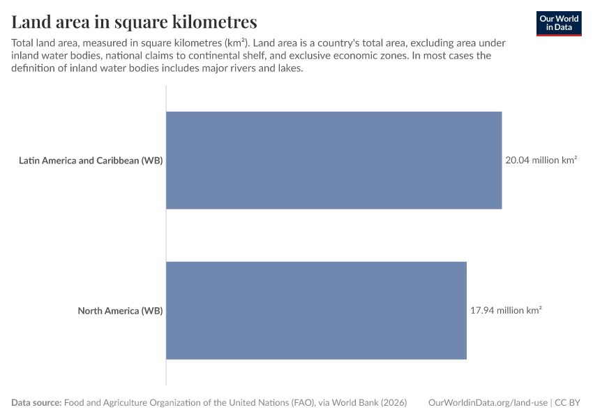 Food and Agriculture Organization of the United Nations (FAO), via World Bank (2025) – processed by Our World in Data. “Land area in square kilometres” [dataset]. Food and Agriculture Organization of the United Nations (FAO), via World Bank, “World Development Indicators 122” [original data]. Retrieved January 9, 2026 from https://chrome-plugin.owid.pages.dev/grapher/land-area-km