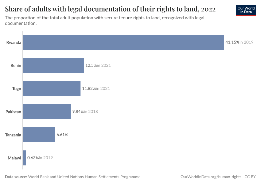World Bank and United Nations Human Settlements Programme – processed by Our World in Data. “Share of adults with legal documentation of their rights to land” [dataset]. World Bank and United Nations Human Settlements Programme, “Data from multiple sources” [original data]. Retrieved January 9, 2026 from https://chrome-plugin.owid.pages.dev/grapher/legally-recognized-rights-to-land