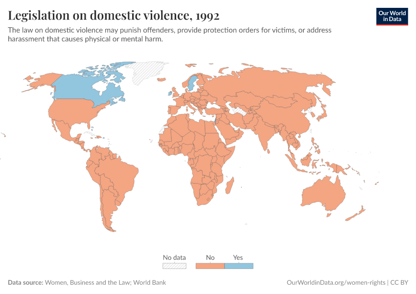 “Data Page: Legislation on domestic violence”, part of the following publication: Bastian Herre, Veronika Samborska, Pablo Arriagada, and Hannah Ritchie (2023) - “Women’s Rights”. Data adapted from World Bank Gender Statistics. Retrieved from https://chrome-plugin.owid.pages.dev/grapher/legislation-domestic-violence [online resource]How to cite this data