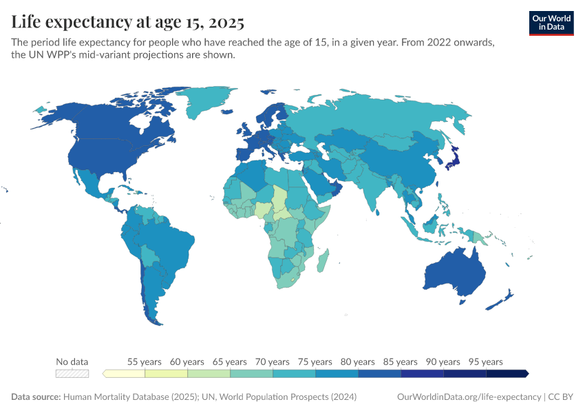 Human Mortality Database (2025); UN, World Population Prospects (2024) – with major processing by Our World in Data. “Life expectancy at 15 – HMD, UN WPP – period tables, with UN medium projections” [dataset]. Human Mortality Database, “Human Mortality Database”; United Nations, “World Population Prospects” [original data]. Retrieved January 9, 2026 from https://chrome-plugin.owid.pages.dev/grapher/life-expectancy-at-age-15