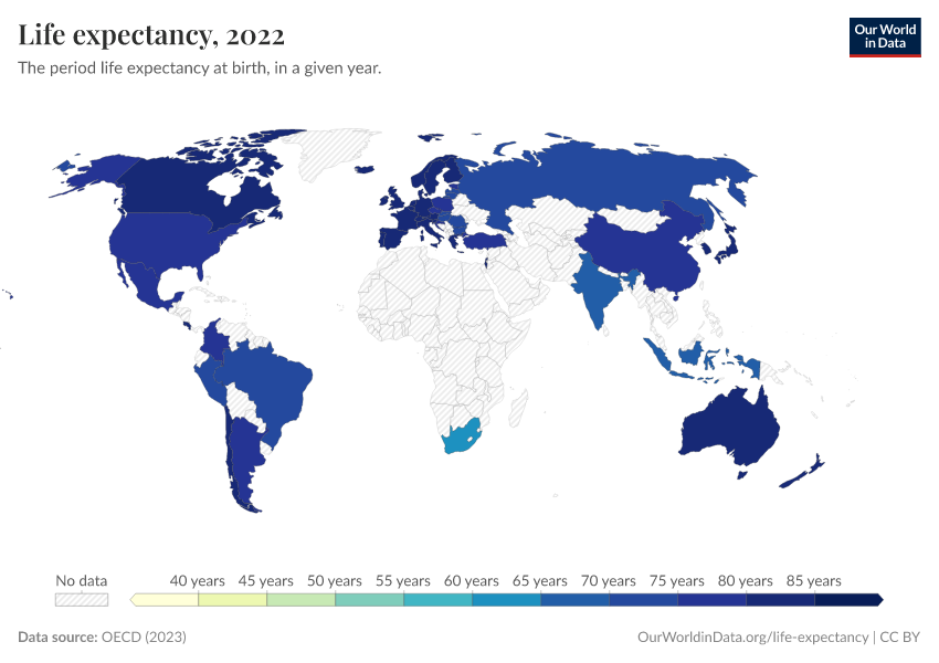 “Data Page: Life expectancy at birth”, part of the following publication: Saloni Dattani, Lucas Rodés-Guirao, Hannah Ritchie, Esteban Ortiz-Ospina, and Max Roser (2023) - “Life Expectancy”. Data adapted from OECD. Retrieved from https://chrome-plugin.owid.pages.dev/grapher/life-expectancy-at-birth-oecd [online resource]How to cite this data