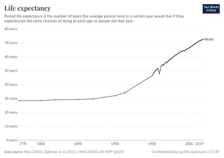 Riley (2005); Zijdeman et al. (2015); HMD (2025); UN WPP (2024) – with major processing by Our World in Data. “Life expectancy – Riley; Zijdeman et al.; HMD; UN WPP – Long-run data” [dataset]. Human Mortality Database, “Human Mortality Database”; United Nations, “World Population Prospects”; Zijdeman et al., “Life Expectancy at birth v2”; James C. Riley, “Estimates of Regional and Global Life Expectancy, 1800-2001” [original data]. Retrieved January 9, 2026 from https://chrome-plugin.owid.pages.dev:8789/20260109-171341/grapher/life-expectancy.html (archived on January 9, 2026).