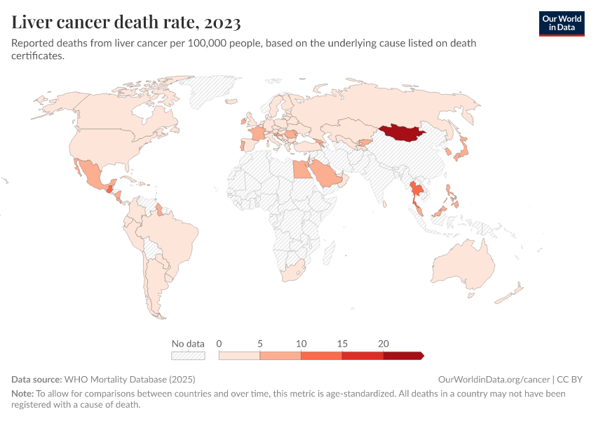 WHO Mortality Database (2025) – with minor processing by Our World in Data. “Liver cancer death rate” [dataset]. WHO Mortality Database, “WHO Mortality Database” [original data]. Retrieved January 9, 2026 from https://chrome-plugin.owid.pages.dev/grapher/liver-cancer-death-rate