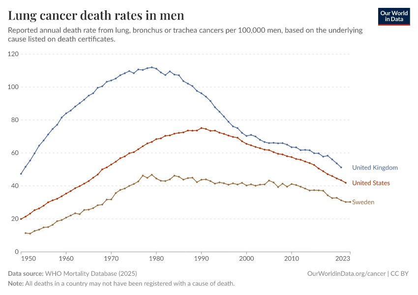 “Data Page: Lung cancer death rates in men”, part of the following publication: Saloni Dattani, Fiona Spooner, Hannah Ritchie, and Max Roser (2023) - “Causes of Death”. Data adapted from WHO Mortality Database. Retrieved from https://chrome-plugin.owid.pages.dev/grapher/lung-cancer-death-rates-males [online resource]How to cite this data