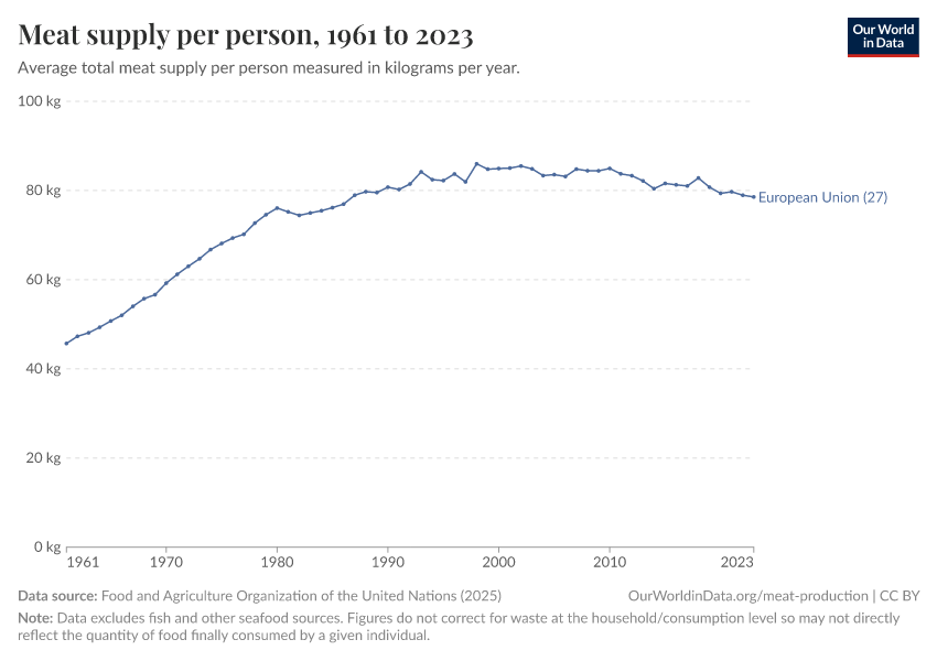 “Data Page: Yearly per capita supply of all meat”. Our World in Data (2026). Data adapted from Food and Agriculture Organization of the United Nations. Retrieved from https://chrome-plugin.owid.pages.dev/grapher/meat-supply-per-person [online resource]How to cite this data