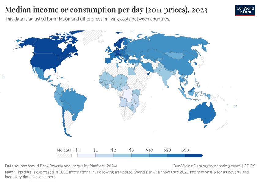 World Bank Poverty and Inequality Platform (2024) – with major processing by Our World in Data. “Median income or consumption per day (2011 prices) – World Bank” [dataset]. World Bank Poverty and Inequality Platform, “World Bank Poverty and Inequality Platform (PIP) 20240627_2017, 20240627_2011” [original data]. Retrieved January 9, 2026 from https://chrome-plugin.owid.pages.dev/grapher/median-income-or-consumption-per-day-2011-prices