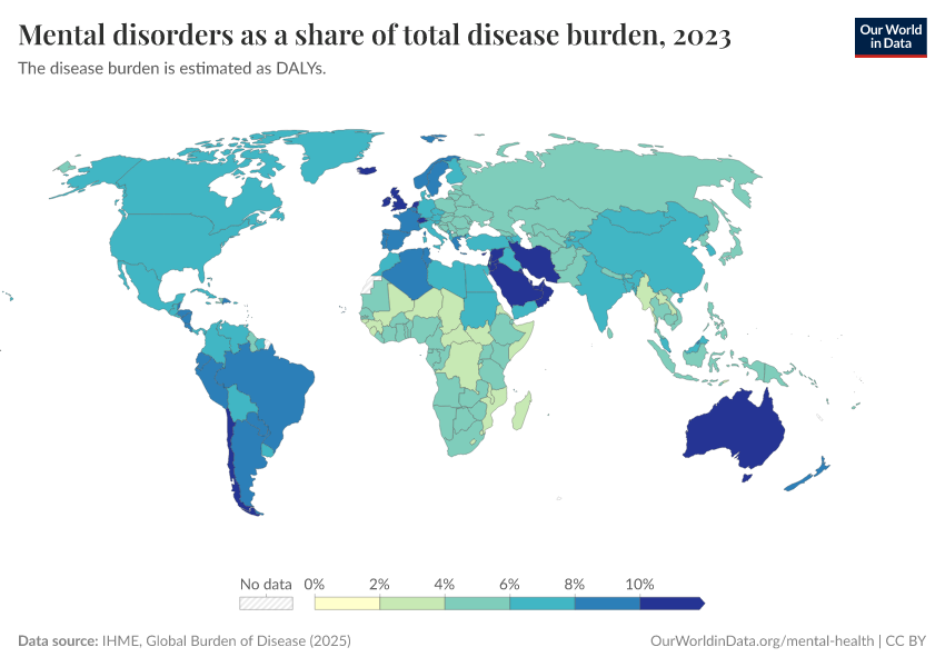 IHME, Global Burden of Disease (2024) – with minor processing by Our World in Data. “Mental disorders as a share of total disease burden” [dataset]. IHME, Global Burden of Disease, “Global Burden of Disease - Deaths and DALYs” [original data]. Retrieved January 9, 2026 from https://chrome-plugin.owid.pages.dev/grapher/mental-and-substance-use-as-share-of-disease