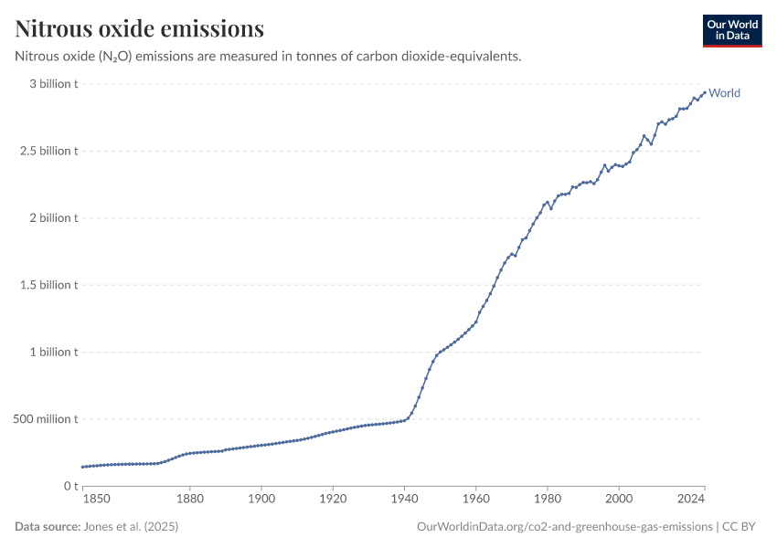 Jones et al. (2025) – with major processing by Our World in Data. “Annual nitrous oxide emissions including land use” [dataset]. Jones et al., “National contributions to climate change 2025.1” [original data]. Retrieved January 9, 2026 from https://chrome-plugin.owid.pages.dev/grapher/nitrous-oxide-emissions
