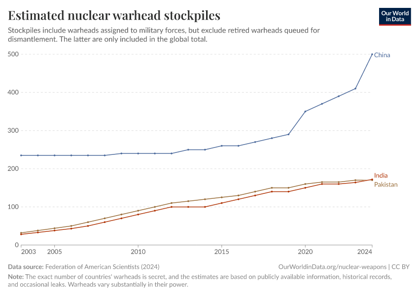 “Data Page: Estimated nuclear warhead stockpiles”, part of the following publication: Bastian Herre, Pablo Rosado, and Max Roser (2024) - “Nuclear Weapons”. Data adapted from Federation of American Scientists. Retrieved from https://chrome-plugin.owid.pages.dev/grapher/nuclear-warhead-stockpiles-lines [online resource]How to cite this data