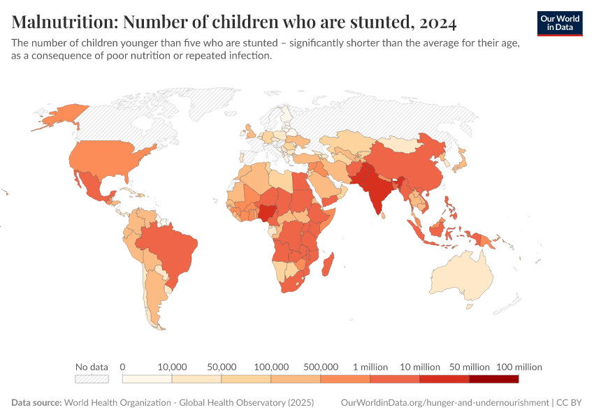 “Data Page: Malnutrition: Number of children who are stunted”. Our World in Data (2026). Data adapted from World Health Organization. Retrieved from https://chrome-plugin.owid.pages.dev/grapher/number-children-stunted-who [online resource]How to cite this data