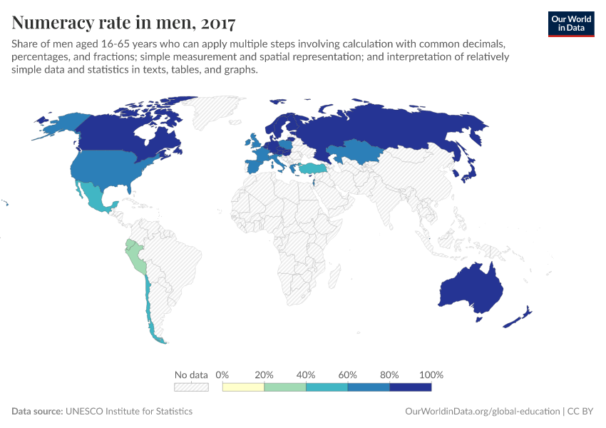 “Data Page: Numeracy rate in men”. Our World in Data (2026). Data adapted from UNESCO Institute for Statistics. Retrieved from https://chrome-plugin.owid.pages.dev/grapher/numeracy-rate-in-adult-men [online resource]How to cite this data