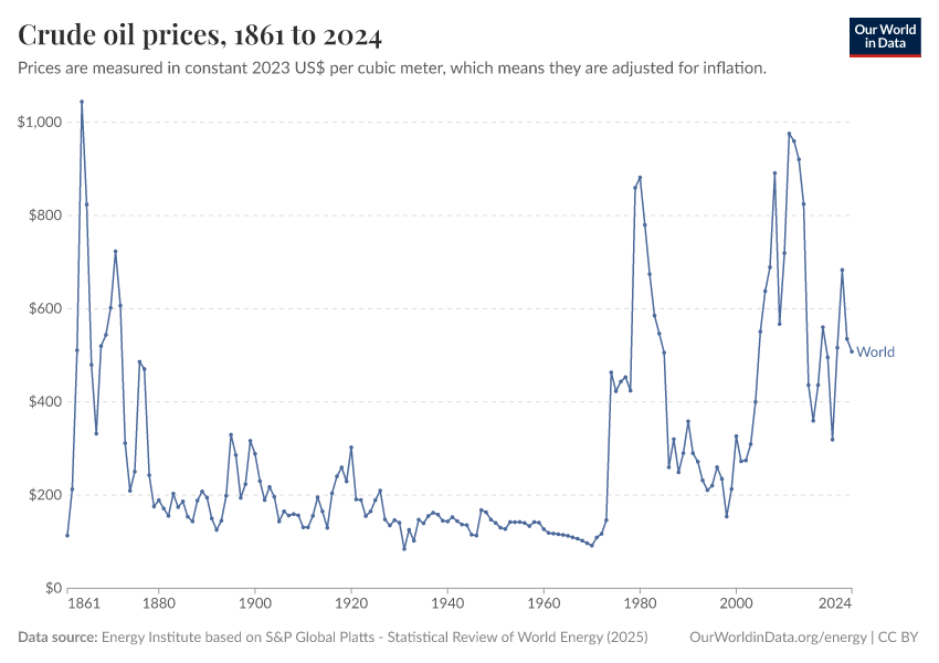 “Data Page: Oil price - Crude prices since 1861”, part of the following publication: Hannah Ritchie, Pablo Rosado, and Max Roser (2023) - “Energy”. Data adapted from Energy Institute. Retrieved from https://chrome-plugin.owid.pages.dev/grapher/oil-prices-inflation-adjusted [online resource]How to cite this data
