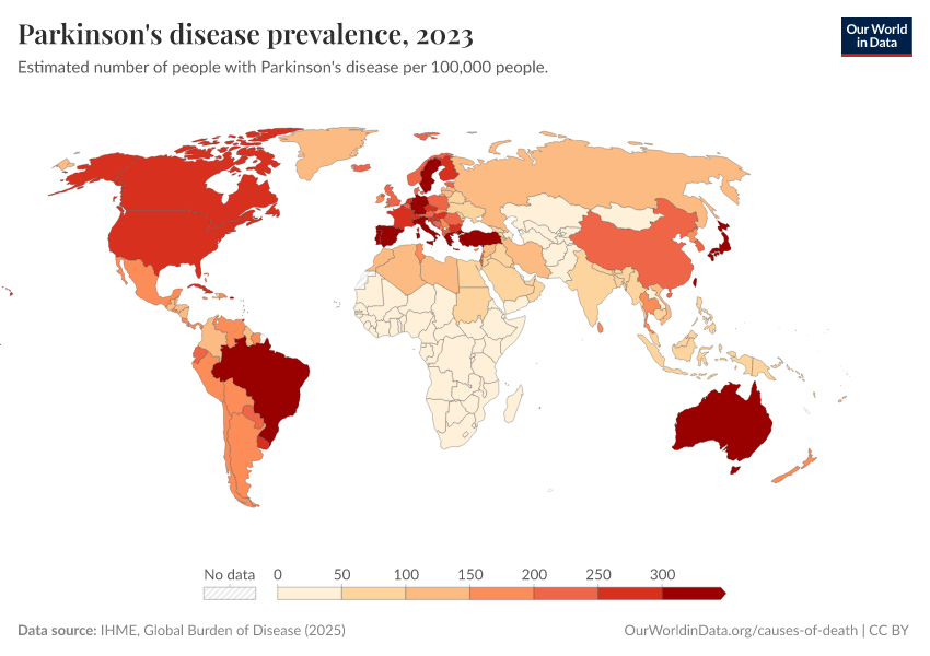 IHME, Global Burden of Disease (2024) – with major processing by Our World in Data. “Parkinson's disease prevalence” [dataset]. IHME, Global Burden of Disease, “Global Burden of Disease - Prevalence and Incidence” [original data]. Retrieved January 9, 2026 from https://chrome-plugin.owid.pages.dev/grapher/parkinsons-disease-prevalence-ihme