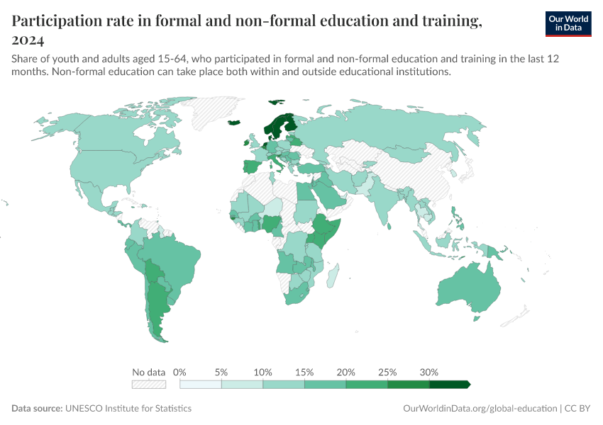 “Data Page: Participation rate in formal and non-formal education and training”. Our World in Data (2026). Data adapted from UNESCO Institute for Statistics. Retrieved from https://chrome-plugin.owid.pages.dev/grapher/participation-rate-in-formal-and-non-formal-education-and-training [online resource]How to cite this data