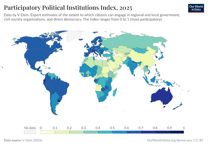 V-Dem (2025) – processed by Our World in Data. “Participatory political institutions – V-Dem” [dataset]. V-Dem, “Democracy report v15” [original data]. Retrieved January 9, 2026 from https://chrome-plugin.owid.pages.dev/grapher/participatory-political-institutions-index